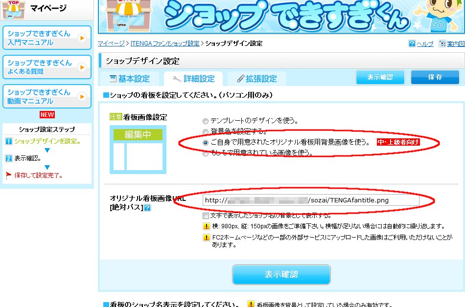 あとは、ショップできすぎくんのショップ看板設定で、「オリジナル看板用背景画像を使う」を選択して、下に現れるURL入力欄に先程保存したURLを設定すれば完成です。